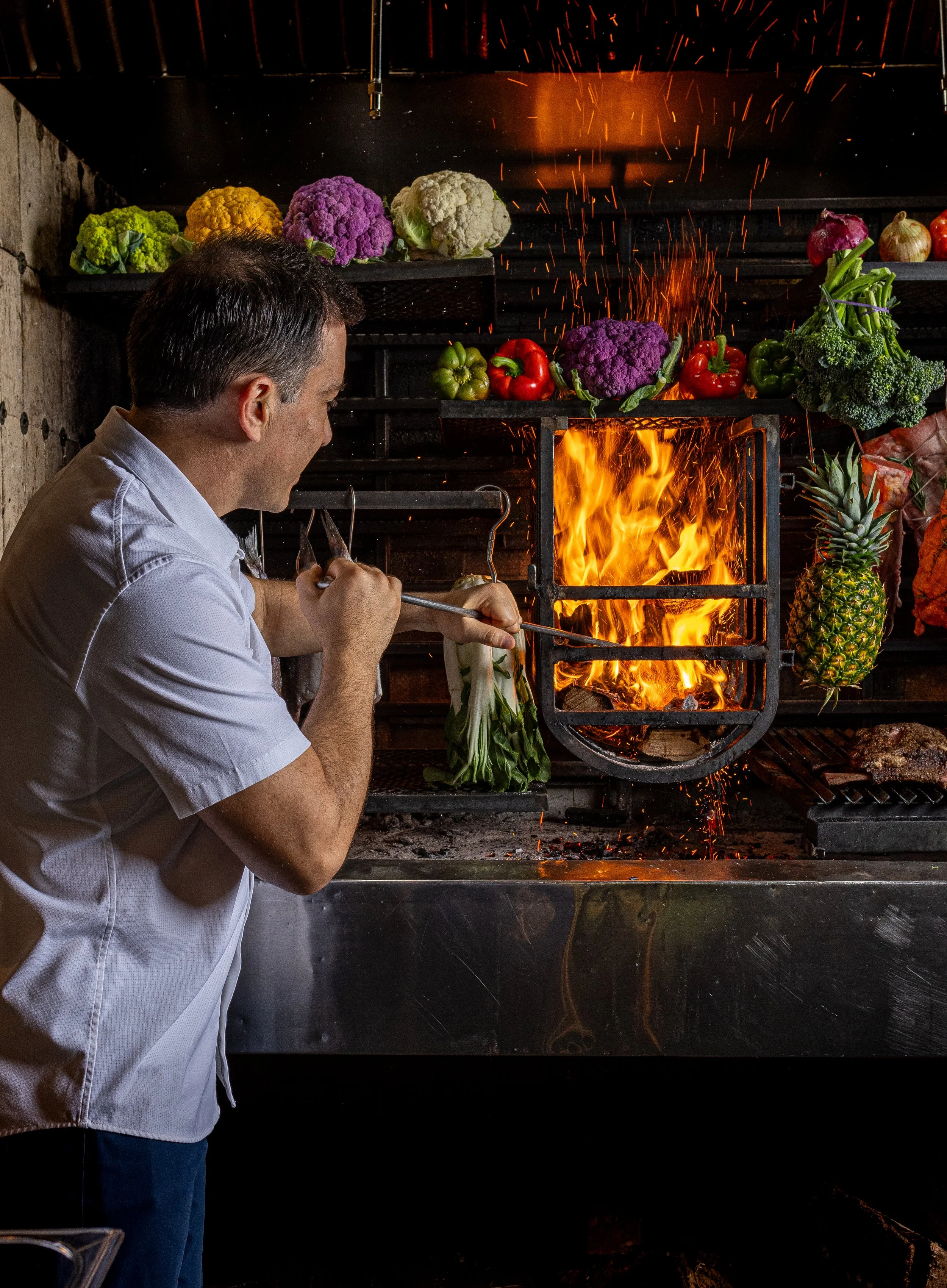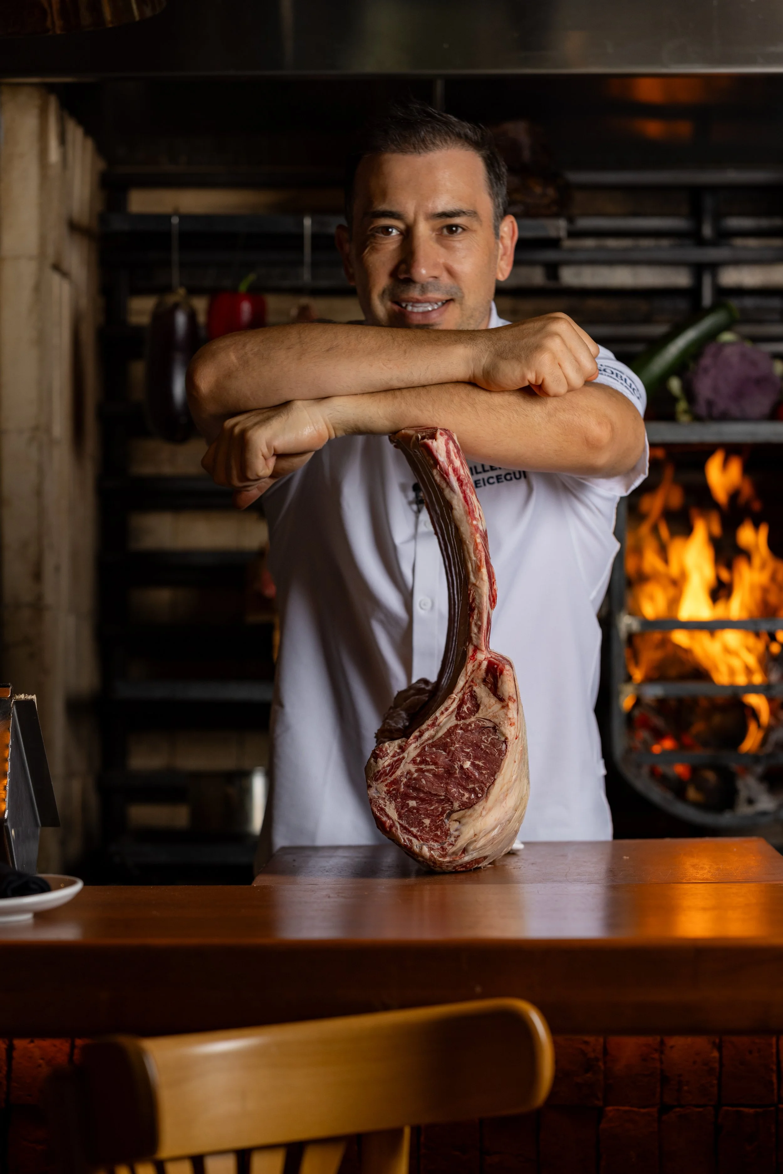 Si la carne es el cuerpo de su cocina, el fuego es su alma. Trabajar con brasas requiere una sensibilidad que la tecnología no puede replicar. “El fuego, para mí, es mucho más que un compañero de trabajo, se convirtió en un estilo de vida,” confiesa. “Tiene algo ritual que obliga a bajar el ritmo y a estar presente. Frente al fuego no hay atajos; te exige atención, respeto y escucha.”
